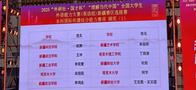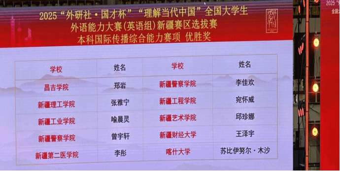 11月1日,2025“外研社·国才杯”“理解当代中国”全国大学生外语能力大赛新疆赛区选拔赛在石河子大学圆满落幕。我校通识学院选派大数据与信息工程学院计算机科学与技术专业学生李奕萱、机电与自动化工程学院自动化专业学生喻晨灵代表新疆工业学院参赛,凭借扎实的语言功底与出色的综合素养,在激烈角逐中脱颖而出,双双斩获佳绩。