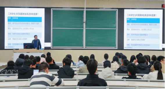 其次,围绕“以赛促学”核心议题,王教授提出“赛事-教学-科研”三位一体的能力提升框架。他指出,英语学科大赛是检验教学成果、锤炼学生综合能力的重要平台。讲座中,王教授还结合国内外知名英语赛事案例,详细阐释了备赛技巧与成果转化方法,为师生提供了可操作的实践指引。