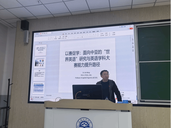 王革教授来自中南财经政法大学,长期深耕世界英语研究、跨文化交际与英语教育创新领域,在多个国际核心期刊发表高水平论文,学术造诣深厚,同时在英语学科赛事指导与区域语言研究方面积累了丰富经验。讲座中,他首先立足中亚地区语言生态与区域合作背景,深入剖析了世界英语变体的形成逻辑与发展趋势,强调“面向中亚的世界英语研究需兼顾语言共性与区域特色,为跨文化交流提供精准语言支撑”。